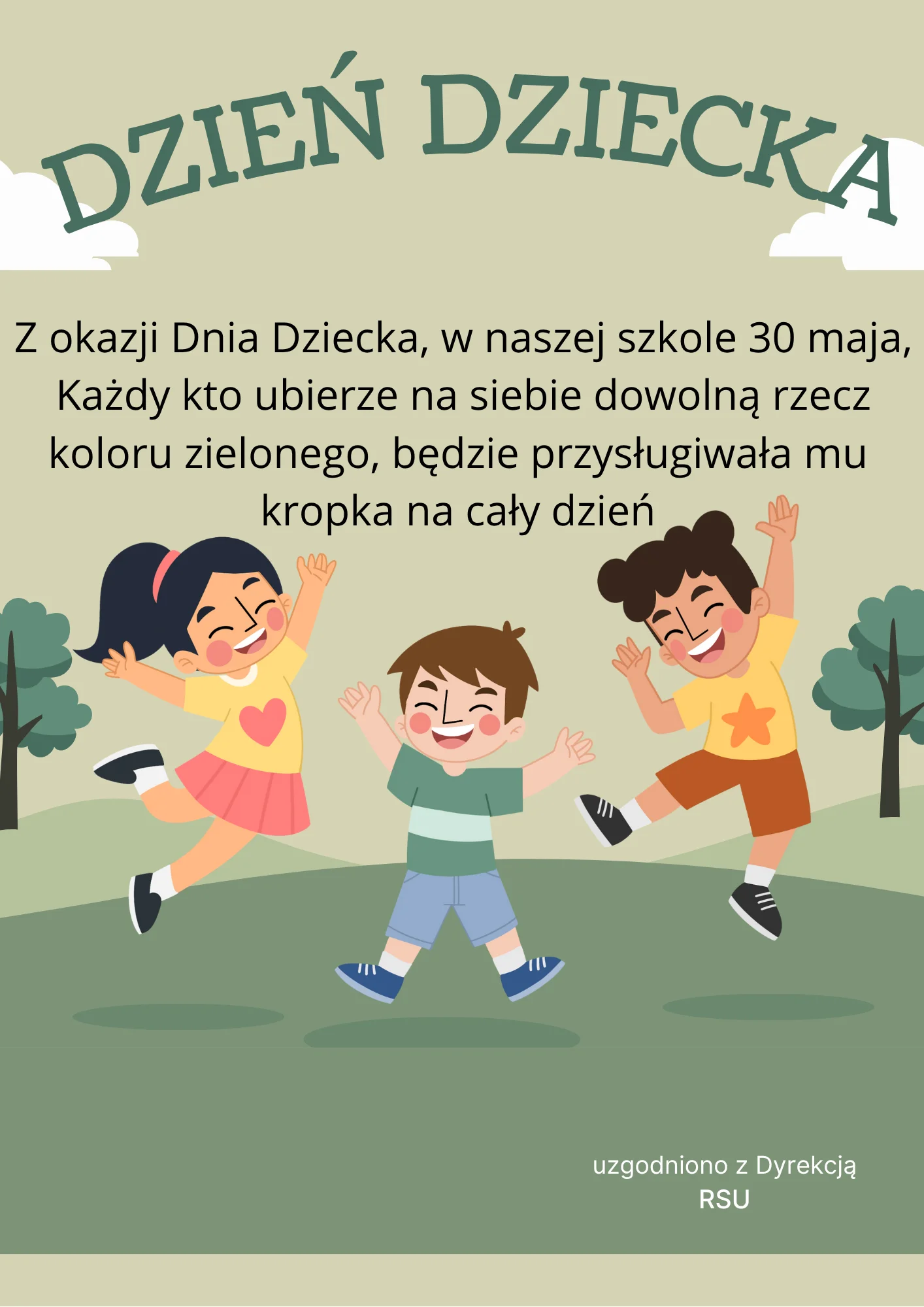 Z okazji Dnia Dziecka, w naszej szkole 30 maja, Każdy kto ubierze na siebie dowolną rzecz koloru zielonego, będzie przysługiwała mu kropka na cały dzień