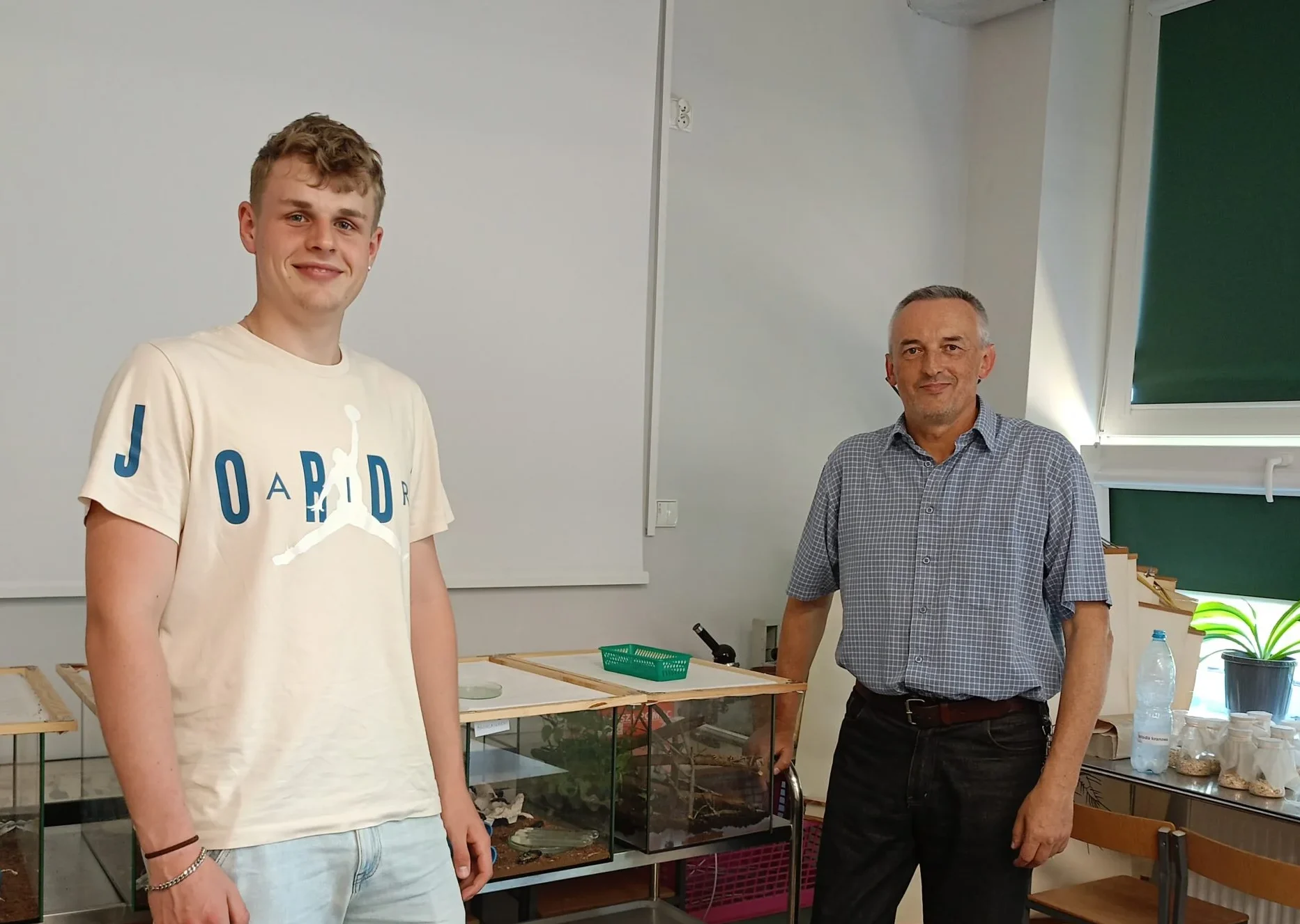 . Na zdjęciu Paweł Porożyński, inicjator szkolnej hodowli z przejmującym opiekę nad owadami prof. Robertem Lamparskim.